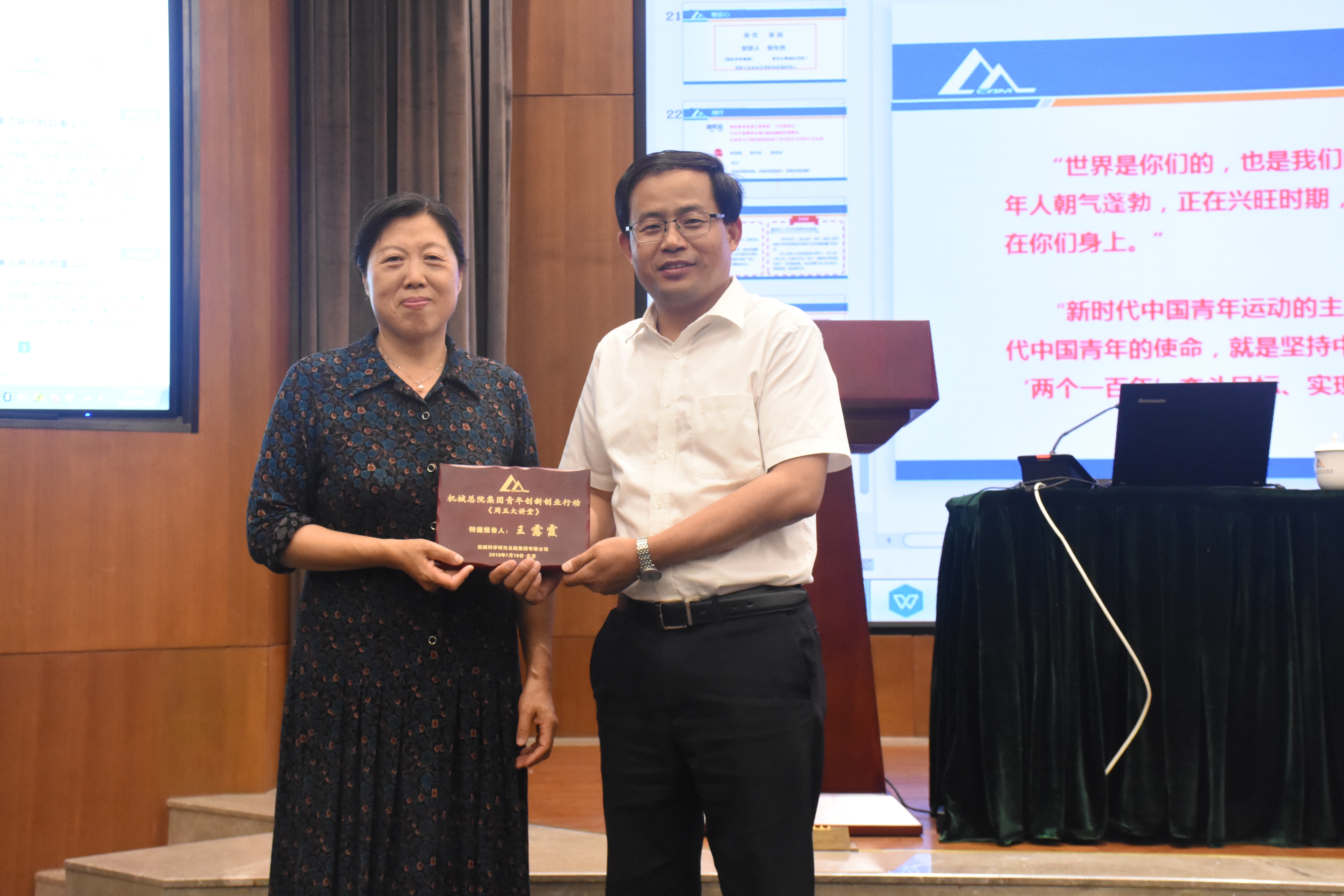 7月16日下午,人資部和機(jī)械總院集團(tuán)團(tuán)委共同舉辦了2019年第六期周五大講堂,本次講堂邀請(qǐng)到原機(jī)械總院黨委副書記、紀(jì)委書記、副院長(zhǎng)王露霞同志,做題為“建功立業(yè)新時(shí)代”的主題講座,集團(tuán)單忠德副總經(jīng)理主持并為王露霞老師頒發(fā)紀(jì)念獎(jiǎng)牌,總院集團(tuán)及在京各二級(jí)單位七十余名研究生、青年員工聆聽了本次報(bào)告。
