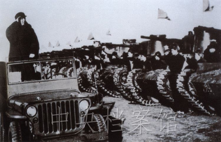 紀(jì)錄片:(群眾呼聲)中國人民萬歲?。o(jì)錄片解說)檢閱開始了。東北野戰(zhàn)軍參謀長劉亞樓將軍,向毛主席報告受檢閱的部隊(duì)全部到齊。坦克塔上飄揚(yáng)著紅旗,坦克手精神百倍,向著自己的領(lǐng)袖敬禮。